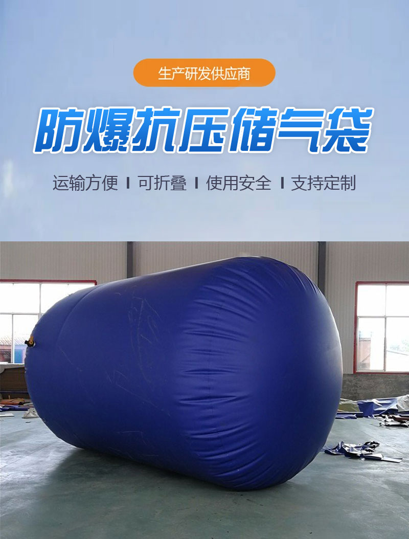 儲氣袋是由高強度塑性材料(雙面PVC夾網布或者優質PVC抗拉膜)經過高頻熱合制成。具有密封性好、重量輕、操作簡單、耐腐蝕、抗老化、運輸方便快捷、價格低廉等特點。廣泛應用于儲存運輸各種工業、農業用氣體(氮氣 天然氣、沼氣、桔梗氣等)。特別適合低壓工業儲氣。